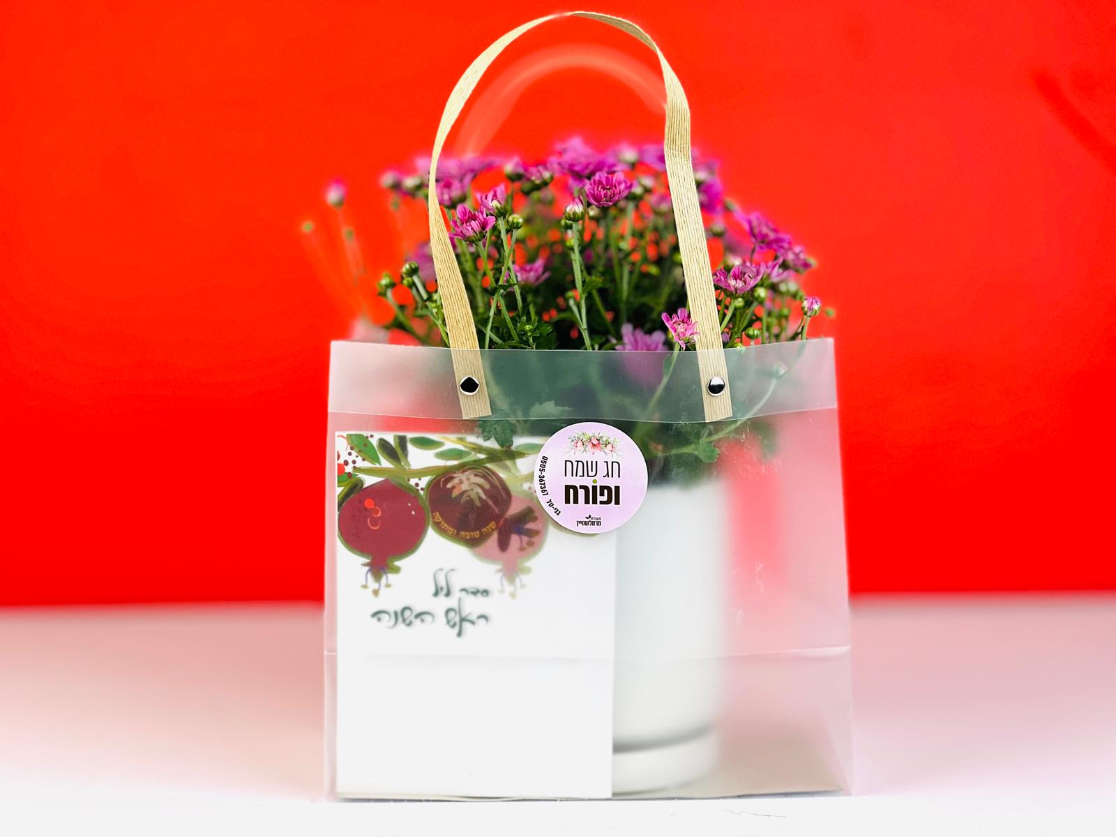 שקית פלסטיק שקופה עם ידיות זהב ומדבקת מיתוג חג שמח